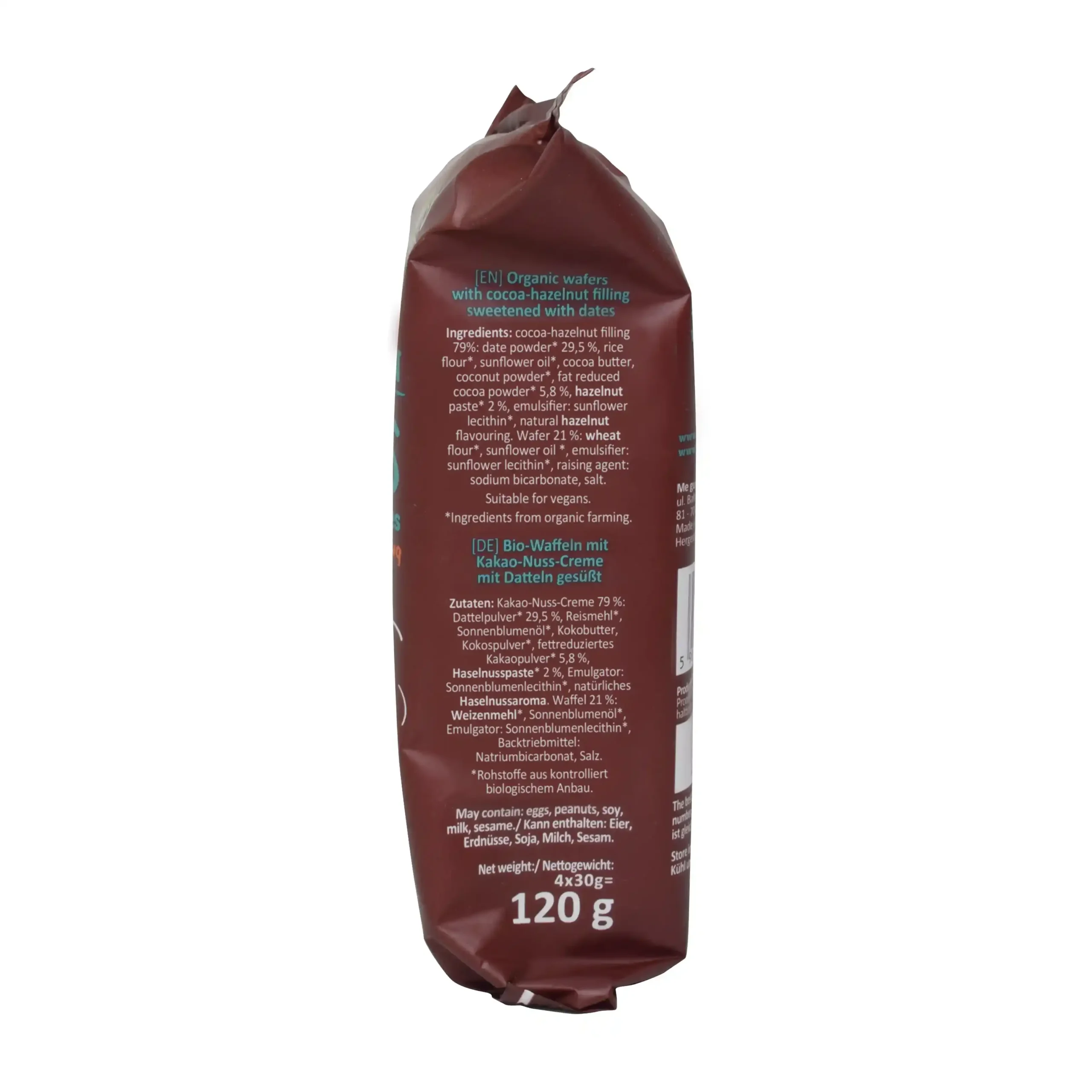 Organic wafers with cocoa-hazelnut cream sweetened with dates –4 x 30 g