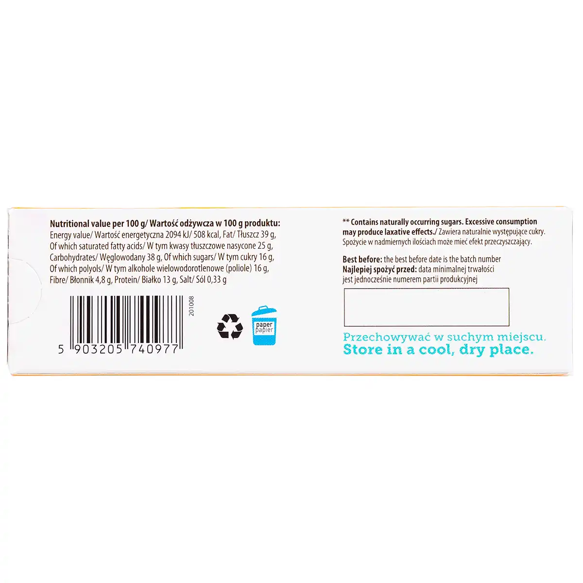 Czekoladowy baton bez cukru z powodzeniem zastąpi tradycyjne słodycze. Cukier w składzie zastąpiono erytrolem — bezpiecznym słodzikiem o licznych zaletach. Batonik zawiera również błonnik wspomagający trawienie oraz białko odpowiadające za długotrwałe uczucie sytości.