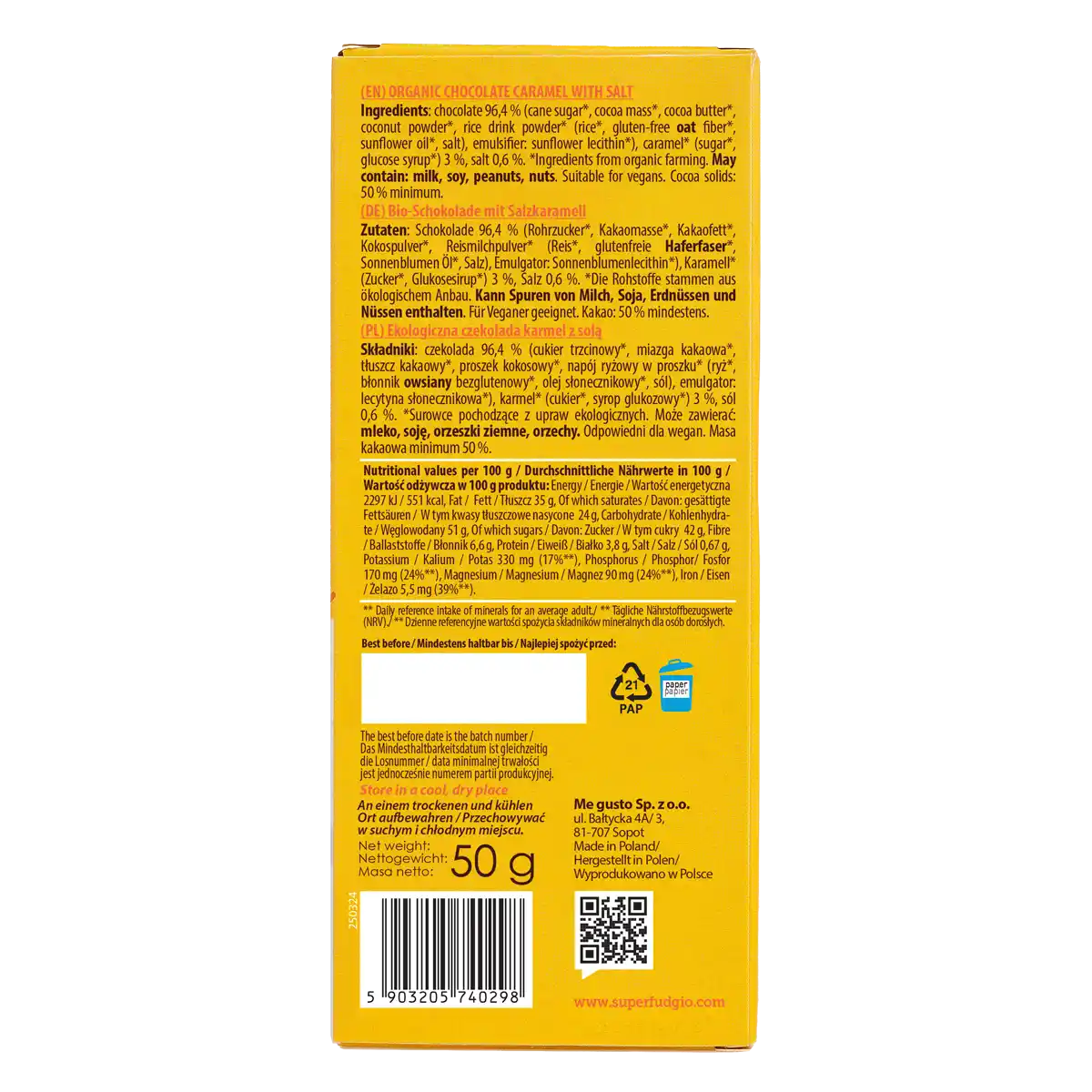 Ta pyszna ekologiczna czekolada karmel z solą została stworzona z myślą o weganach i jest całkowicie pozbawiona składników pochodzenia zwierzęcego. Nie zawiera również GMO, oleju palmowego ani glutenu, więc każdy może cieszyć się jej wyjątkowym smakiem. Nasza czekolada jest wyprodukowana z ekologicznych składników, co sprawia, że jest nie tylko pyszna, ale również wolna od nawozów sztucznych i pestycydów. Wybierając naszą bio czekoladę karmel z solą, możesz cieszyć się słodkimi przyjemnościami bez wyrzutów sumienia.