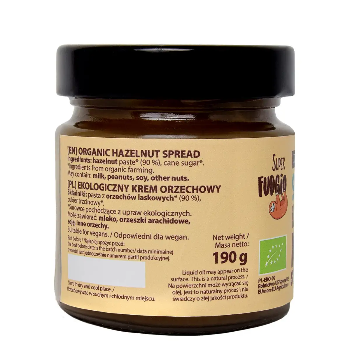 Ekologiczny krem orzechowy (190 g) zawiera aż 90% orzechów laskowych wzbogaconych tylko cukrem trzcinowym. Orzechy laskowe są bogactwem jednonienasyconych kwasów tłuszczowych, witaminy E, wielu witamin z grupy B (B1, B2, B3, B6, B9) oraz składników mineralnych, w tym potasu, fosforu, magnezu, żelaza, cynku i miedzi. Krem na długo zapewnia uczucie sytości i jest zdrowszą alternatywą dla tradycyjnych kremów kanapkowych.
