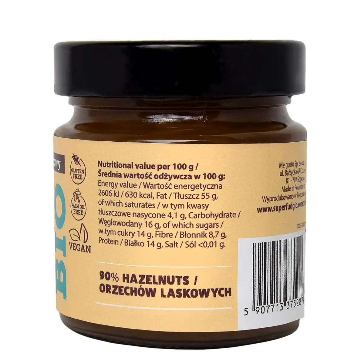 Organiczny wegański krem orzechowy zawiera tylko dwa składniki pochodzące z surowców z ekologicznych upraw. Naturalne składniki zapewniają wartości odżywcze oraz walory smakowe, które długo pozostają w pamięci. Wegański krem orzechowy zawiera aż 90% pasty z orzecha laskowego, co czyni go jednym z najlepszych kremów na rynku. Produkt nie ma w składzie oleju palmowego, GMO, białego cukru, sztucznych ulepszaczy i glutenu.